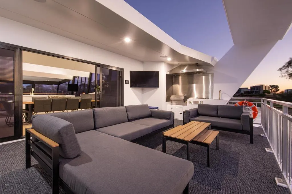 Features include an undercover sundeck, rooftop driving helm, and gourmet BBQ.
